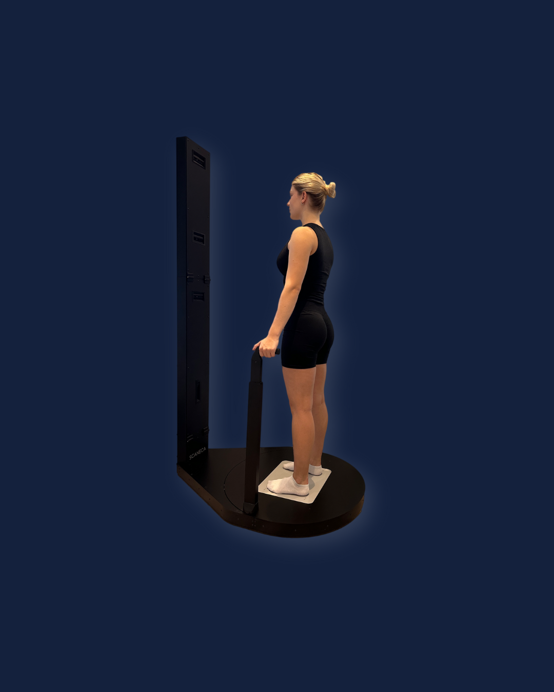 Du stehst entspannt auf der Messplattform, während das System automatisch dich herum rotiert.